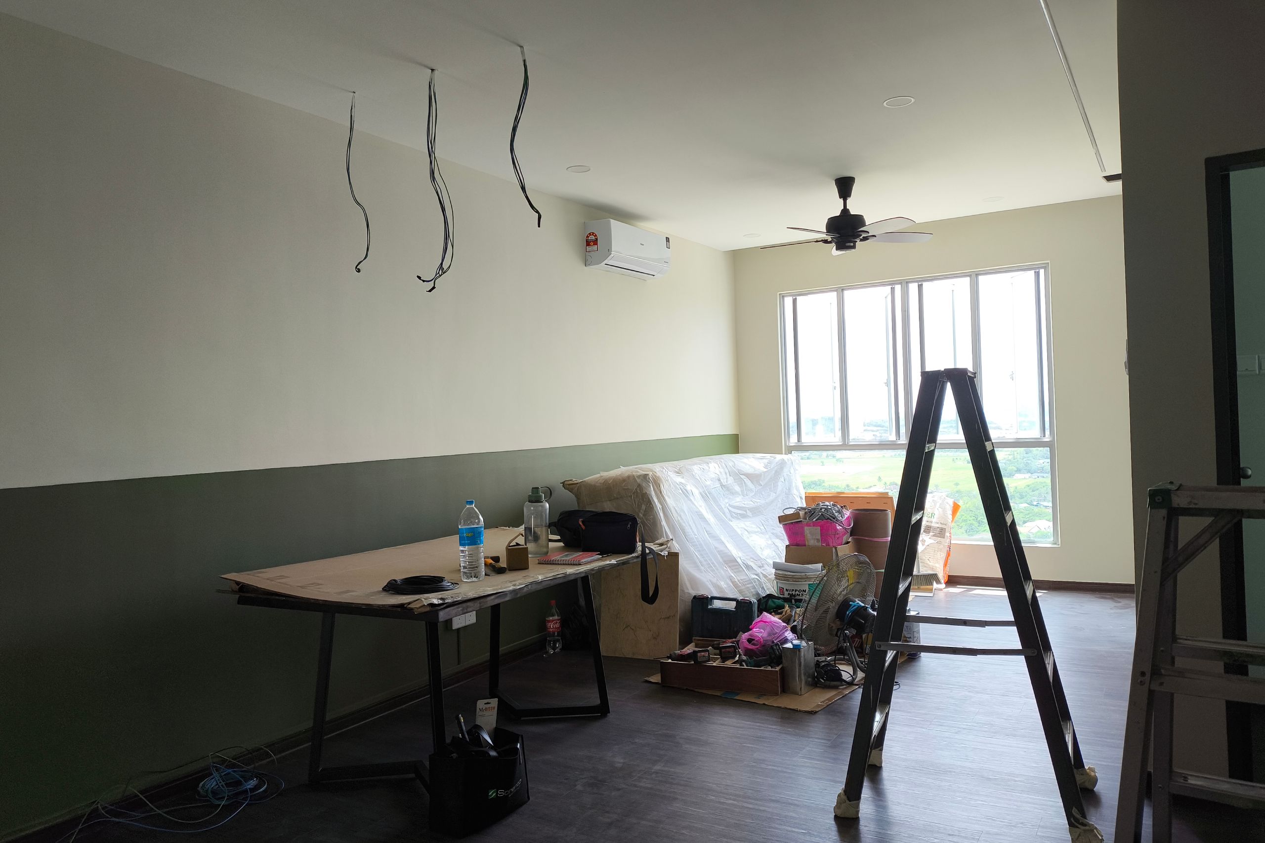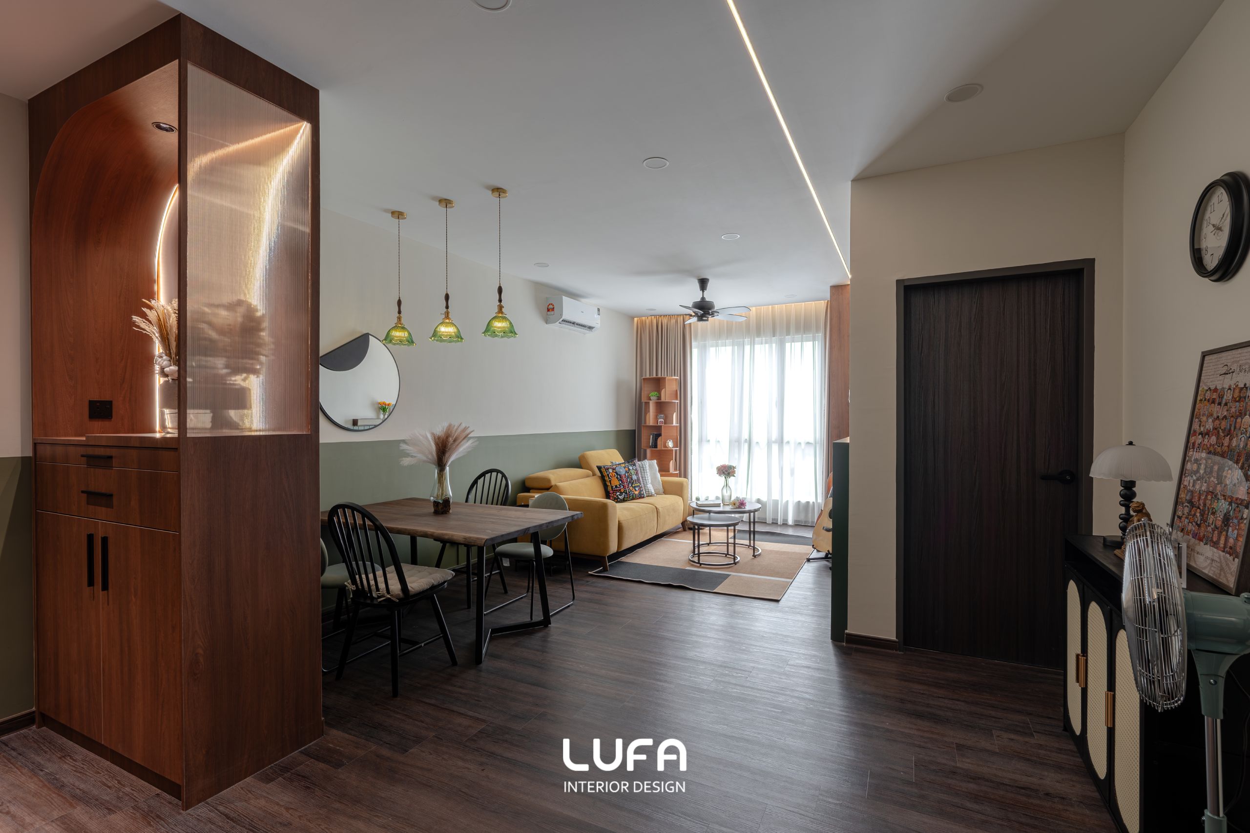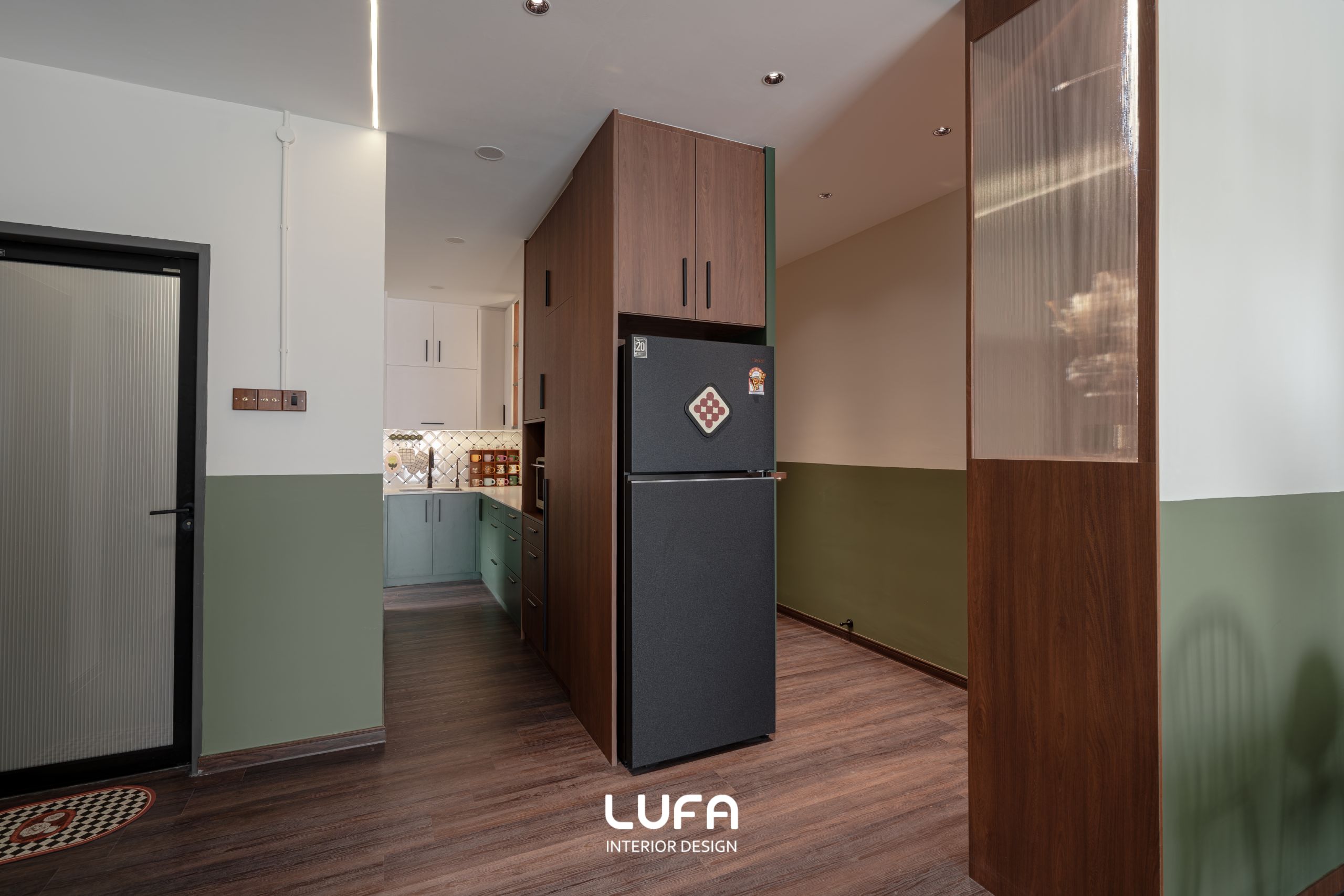 This 900 sqft condominium creates a harmonious dialogue between modern functionality and nostalgic warmth. Anchored by a soothing palette of sage green and rich timber, the design creates a cohesive visual flow that stretches from the kitchen to the living area.