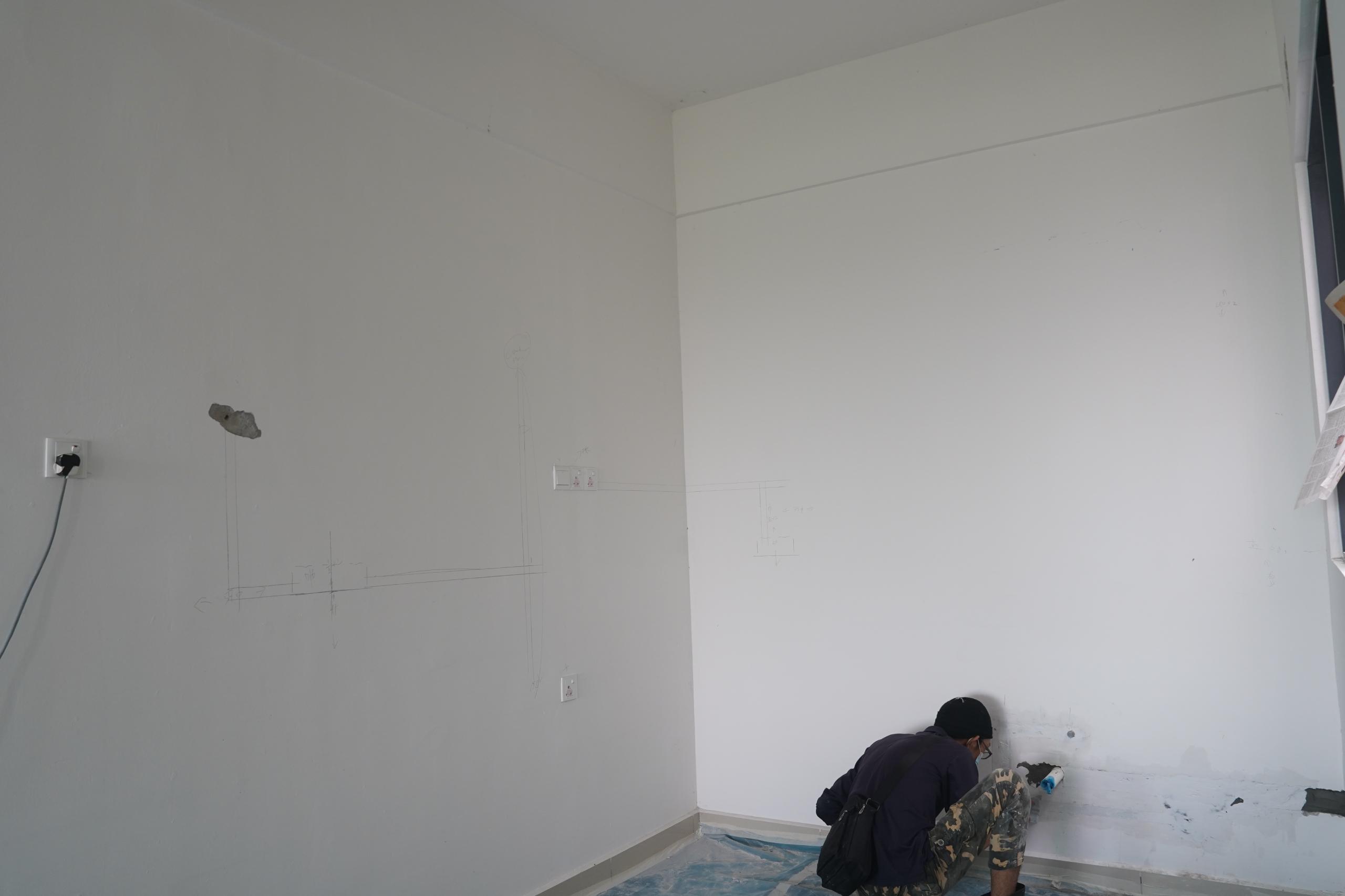 Living & Dining An expressive canvas of light and shadow. The open-plan layout is anchored by a bespoke linear wall lamp bearing the couple’s initials, adding a signature touch of exclusivity. A dark textured feature wall contrasts beautifully with the soft beige furnishings. Kitchen & Foyer Smart design meets sleek aesthetics.